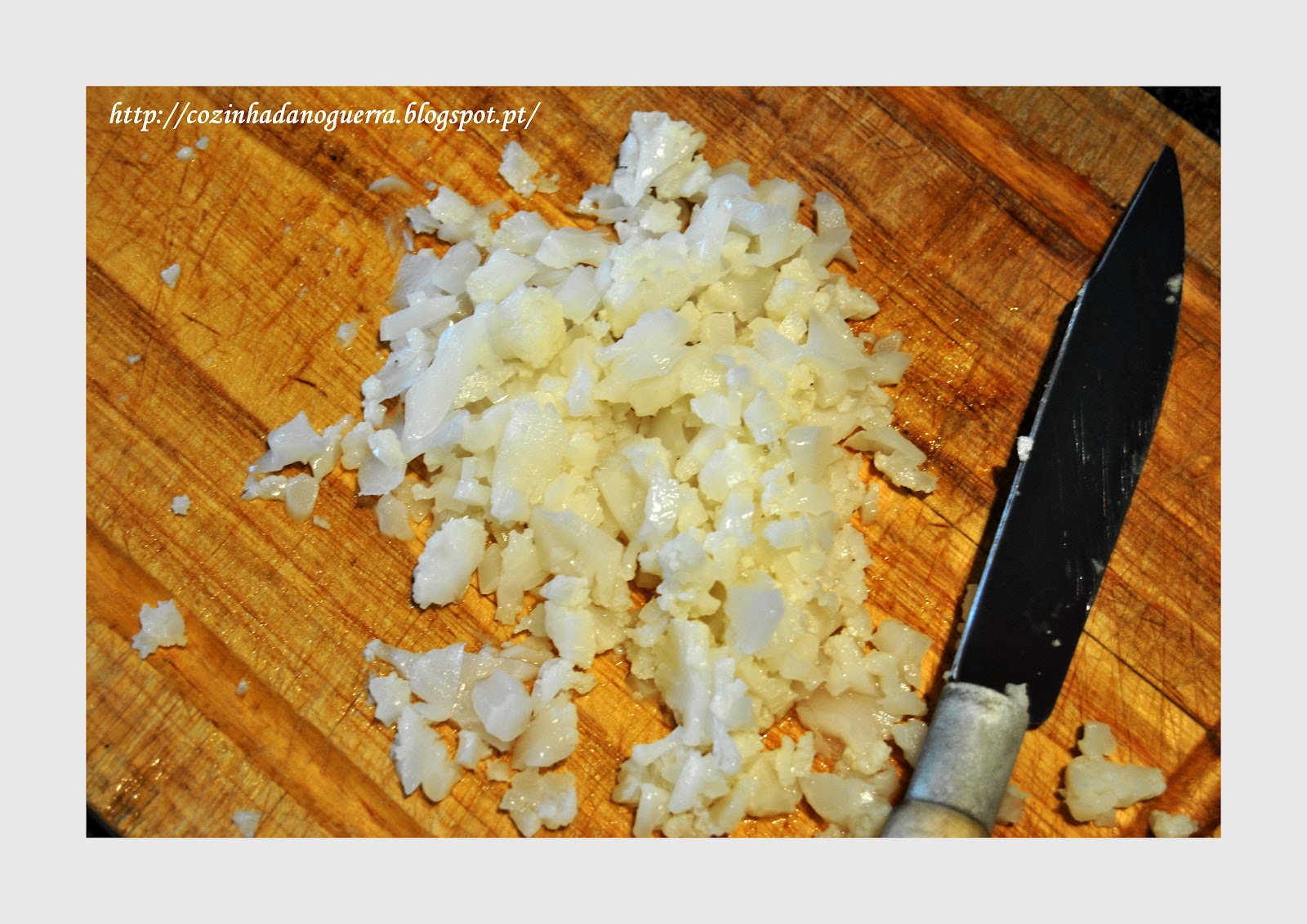 Retire as pevides e as partes brancas do pimento e corte-o aos cubos pequenos.
